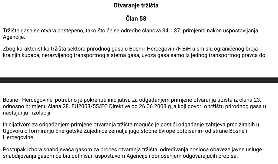 “Tržište gasa se otvara postepeno, tako što će se odredbe članova 34. i 37. primjeniti nakon uspostavljanja Agencije…Postupak izbora snabdjevača gasom za proces otvaranja tržišta, određivanja nosioca obaveze javne usluge snabdijevanja gasom će biti definisan uspostavom Agencije i donošenjem odgovarajućih propisa”, stoji u Uredbi.