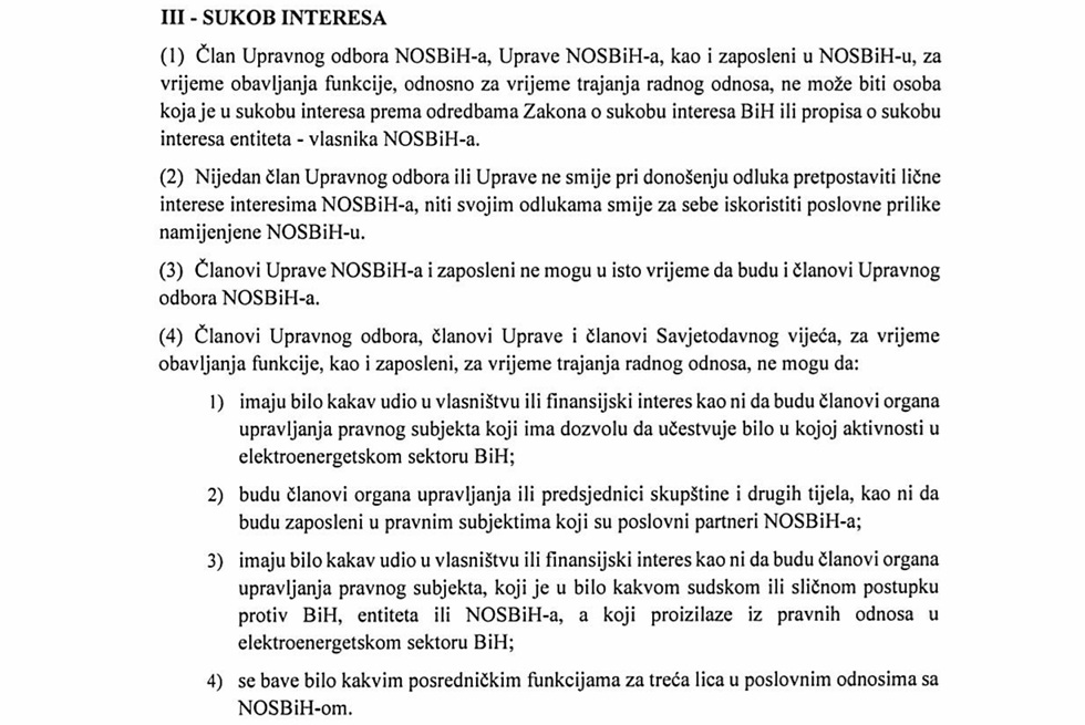 Prema Etičkom kodeksu Nezavisnog operatora sistema, Marijanović i Primorac su u sukobu interesa. Kodeks propisuje da članovi Upravnog odbora ovog tijela za vrijeme obavljanja funkcije “ne mogu da imaju bilo kakav udio u vlasništvu ili finansijski interes, kao ni da budu članovi organa upravljanja pravnog subjekta koji ima dozvolu da učestvuje bilo u kojoj aktivnosti u elektroenergetskom sektoru BiH”. Također, ne mogu biti “članovi organa upravljanja ili predsjednici skupštine i drugih tijela, kao ni da budu zaposleni u pravnim subjektima koji su poslovni partneri NOSBiH-a”.