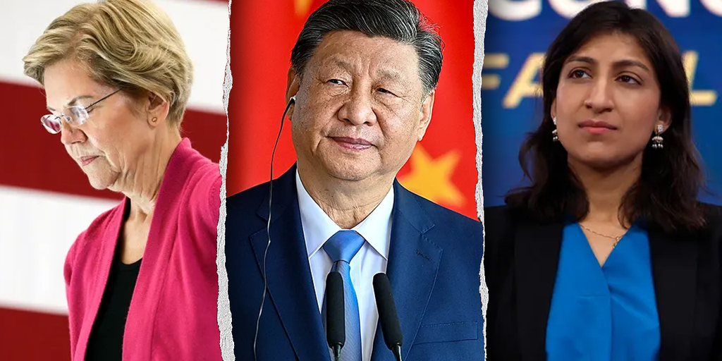 Slijeva nadesno: senator Elizabeth Warren, D-mas., kineski predsjednik Xi Jingping i Bidenova bivša predsjednica FTC-a Lina Khan. (Cheryl Senter/AP Photo; Ton Molina/Bloomberg preko Getty Images; Anna Moneymaker/Getty Images)