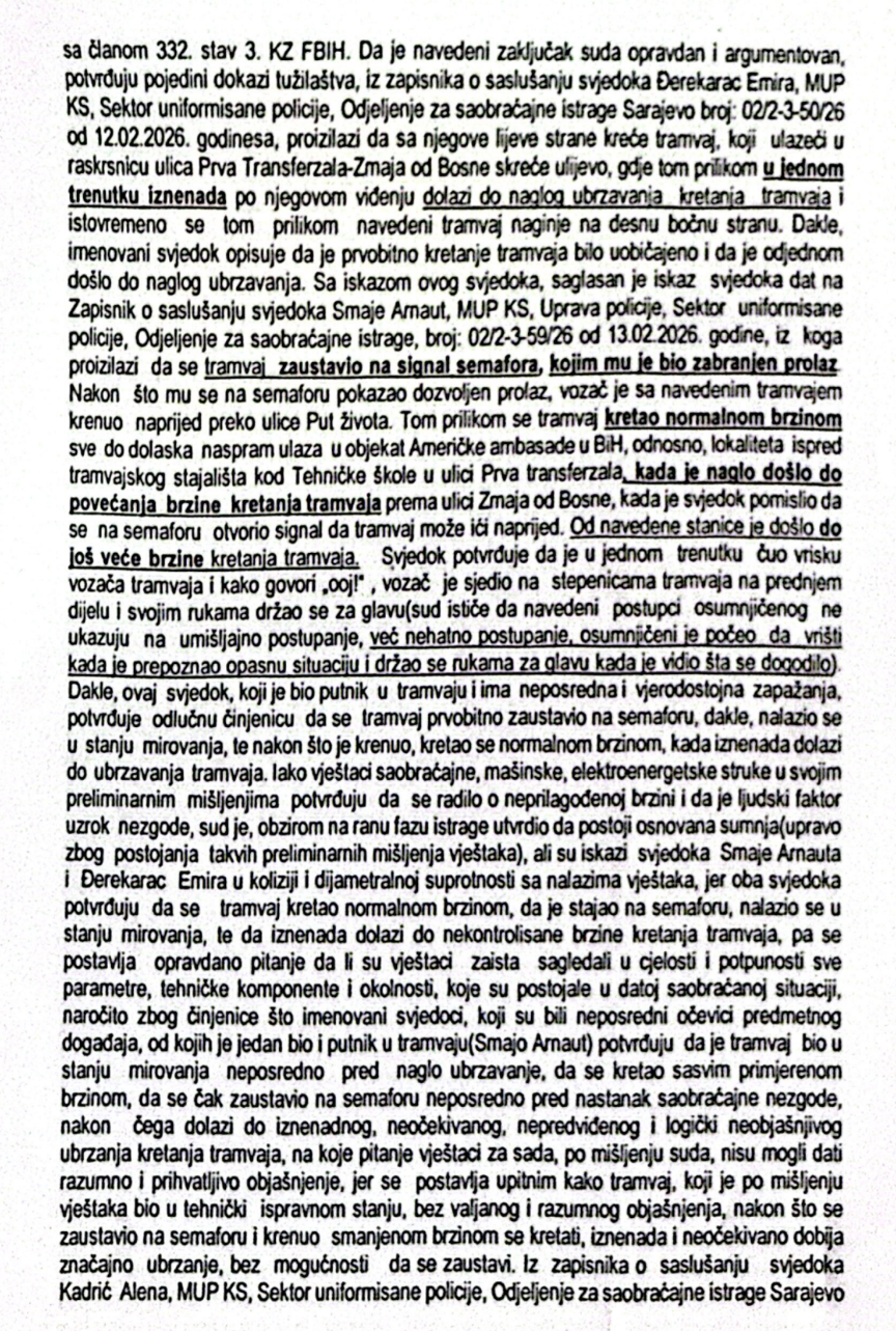 “Postavlja se upitnim kako tramvaj, koji je po mišljenju vještaka bio u tehnički ispravnom stanju, bez valjanog i razumnog objašnjenja, nakon što se zaustavio na semaforu i krenuo smanjenom bzrinom se kretati, iznenada i neočekivano dobija značajno ubrzanje bez mogućnosti da se zaustavi”.
