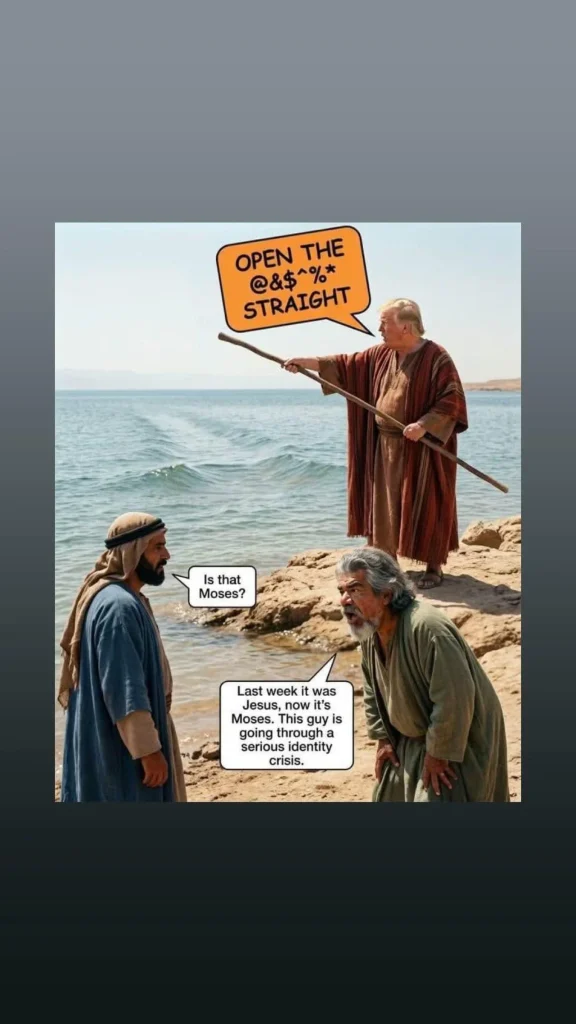 Ovaj pak prikazuje Trumpa kako, stojeći uz obalu Bliskog istoka, u svećeničkoj halji i s pastirskim štapom u ruci, urla: “Otvorite je..ni tjesnac!”