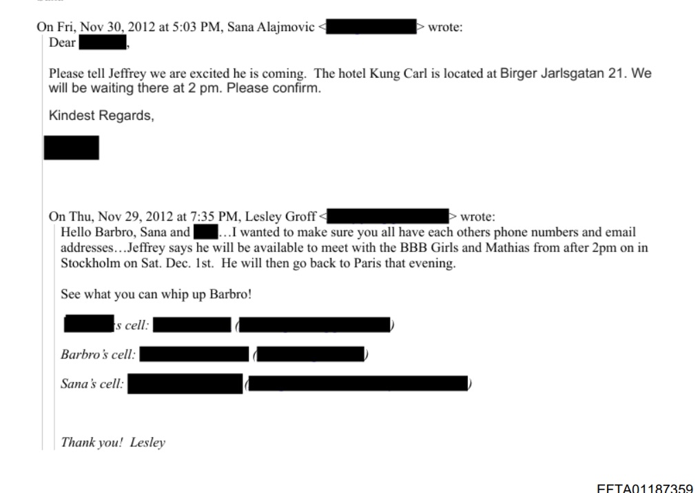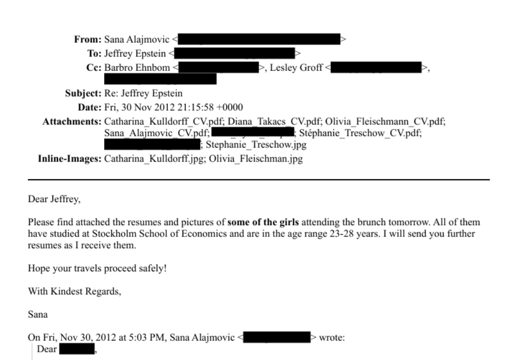 “Dragi Jeffrey, u attachmentu pronađi rezimee i fotografije nekih od djevojaka koje će doći na sutrašnji brunch. Sve one su studirale na Stockholm School of Economics i starosti su od 23-28 godina. Poslat ću ti dodatne rezimee kada ih dobijem. Nadam se da će tvoje putovanje proći sigurno! Uz ljubazne pozdrave, Sana.”