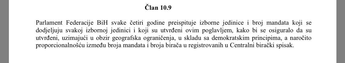 Izborni zakon BiH u članu 10.9 određuje da Parlament Federacije BiH svake četiri godine preispituje izborne jedinice i broj mandata kako bi se osiguralo da su utvrđeni, uzimajući u obzir geografska ograničenja, u skladu sa demokratskim principa, a naročito proporcionalnošću između broja mandata i broja birača registrovanih u Centralni birački spisa. Parlament FBiH nije proveo takva usklađivanja iako mu to zakon omogućava.